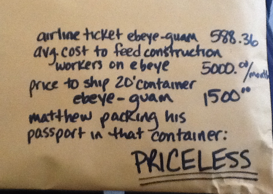 Early one morning I received a call from the container company(matson),they said the ship had arrived and they were on their way to pick up our final container. Point being.... ANYTHING that we needed to ship out had to be in that container ASAP. All other activities were put on hold and items were packed into the container with a quickened pace. I quickly assessed what I could bring on the plane( I was going to be the last to leave the island) and what I needed to load into the container. We successfully loaded the container and had it shipped away to Guam, home of our next construction project. A sense of relief and peace came over me. All that was left to do, was wait for the cargo from Guam. And wait we did. Earlier in January united airlines finally flies our cargo to Kwajalein. In order to pick up our freight we need to take a ferry to kwaj. and then receive clearance from the military to be permitted on the military island. The end is near.... Or so I thought. As I approach the immigration counter I reach for my wallet to show my ID. It hits me... I forgot my wallet at the missionary home in ebeye! How stupid!.... And then it hits me....my ID does me no good, I need my passport!... Where is my PASSPORT???!!!...whatever joy or relief I had been experiencing up to this point had now fled. Disbelief reigned supreme. "Surely I didn't pack my passport into the container headed for Guam. It MUST be at home hiding under a sock or in between two pairs of under clothing. As soon as I got back to the missionary home I went looking for my "Misplaced" passport. As many times as I searched is as many times as I came up in want of a passport. As embarrassing as it is to lock yourself outside the office during your night watch somewhere in the middle of nowhere, it is infinitely more embarrassing to realize that you have trapped yourself on a little island the size of a thumbnail, somewhere in the middle of the pacific ocean. My passport was on a boat headed to Guam, and I was stranded on the island of Ebeye.